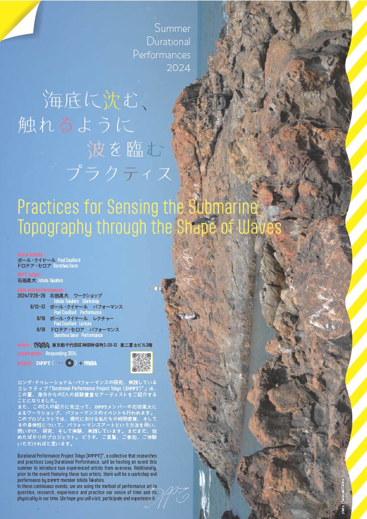 DPPTでの企画、夏に大きな山場を迎えます。メンバーの石田高大さんによる27時間パフォーマンス、カナダからポール・クイヤールさんが24時間パフォーマンス、ドイツのドロテア・セロアさんが4時間の参加型のパフォーマンスを行います。ポール・クイヤールさんからは、Durational Performanceについてのレクチャーもしていただきます。