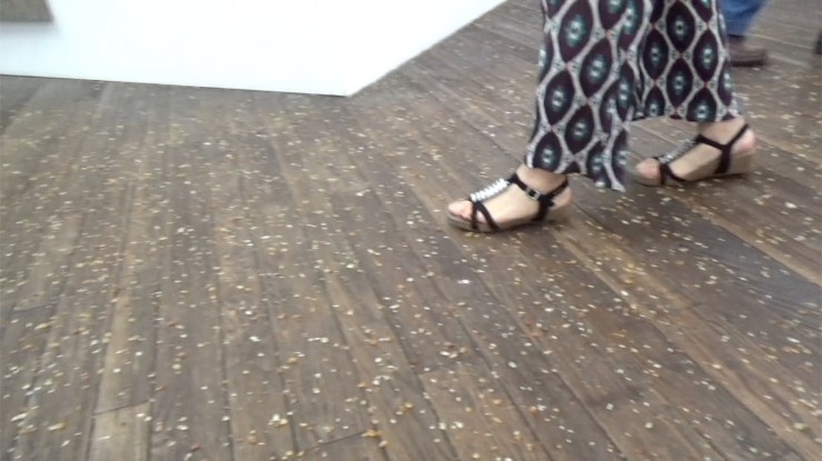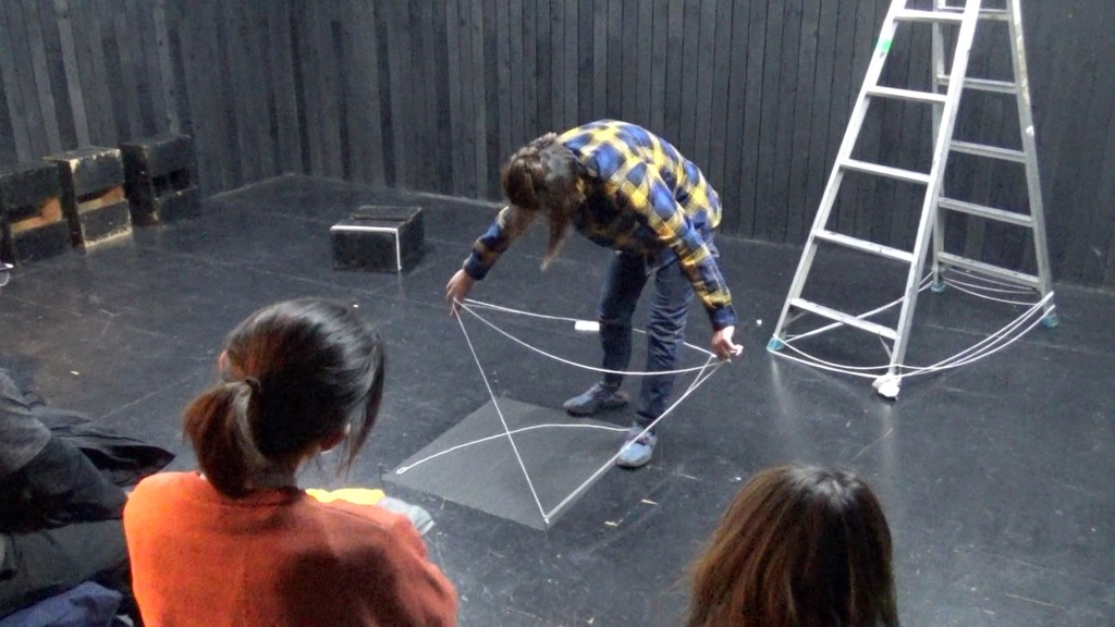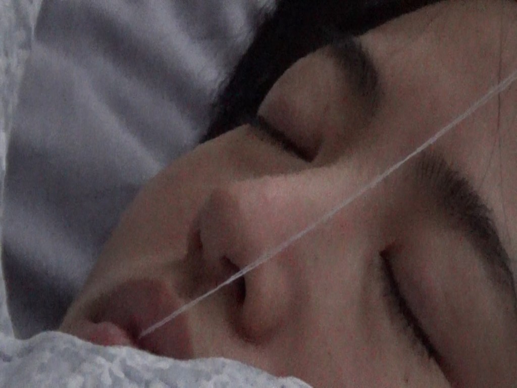 アーティストトークで自分の事を話す。話しながら頭にトマトの形の針刺しをつける。口をあけて歯一本一本にミシン糸を巻き付けてゆく。何か自分の作品のことを話しているようだが、声は聴きとれるようなものではない。10個の糸を歯に巻き付けると、10本の糸をまとめ唾液を垂らしてゆく。唾液が流れ床につくまで。ミシン糸を観客の口の中に入れてゆく。二階へ投げる。ゆっくりと後ずさり始める。糸が観客の口の中から吐き出されてゆく。糸は延び、隣の部屋まで行く。段々と一本ずつ糸が切れてゆく。ずごい力がかかり歯が痛い。戻ってきたところで全ての糸が切れ、終わる。