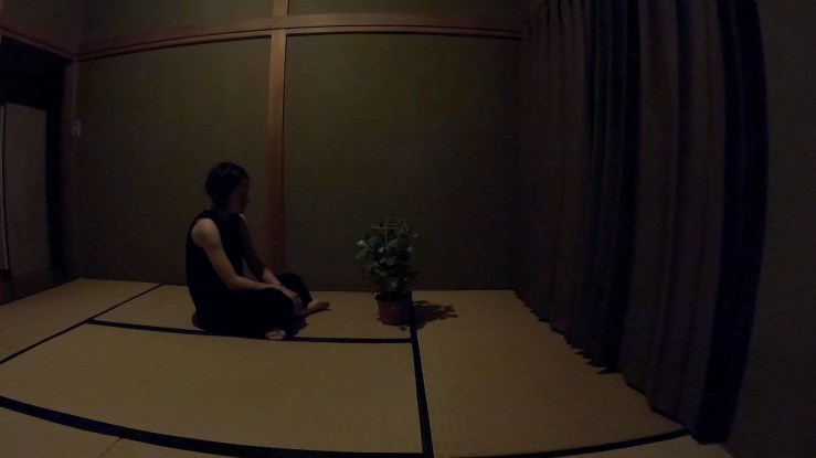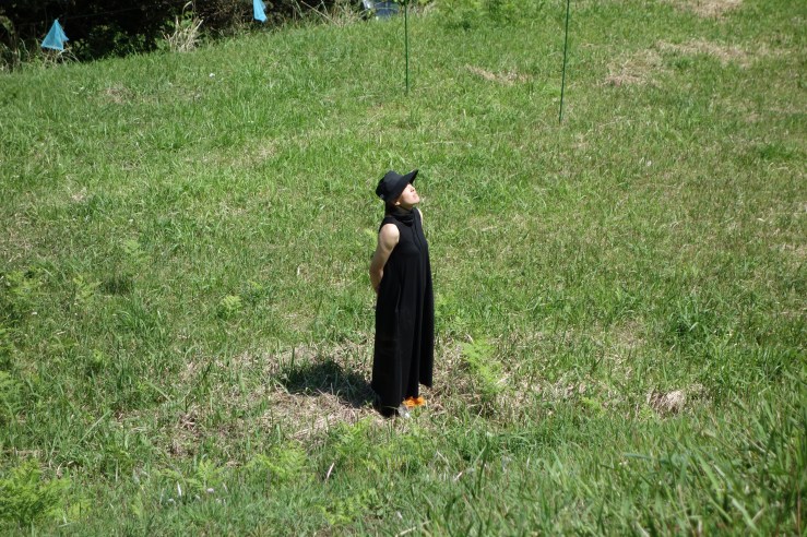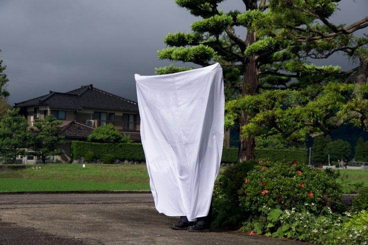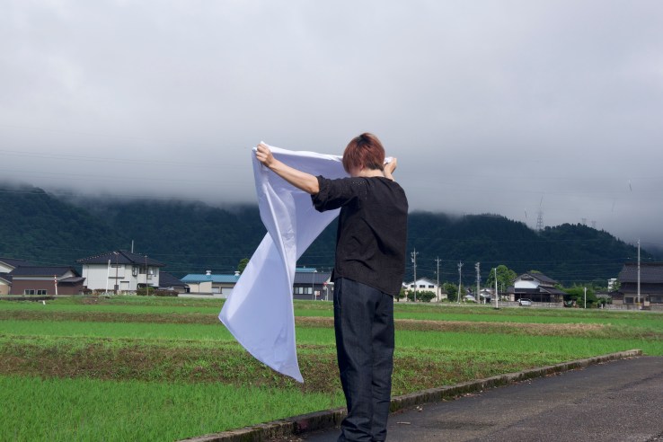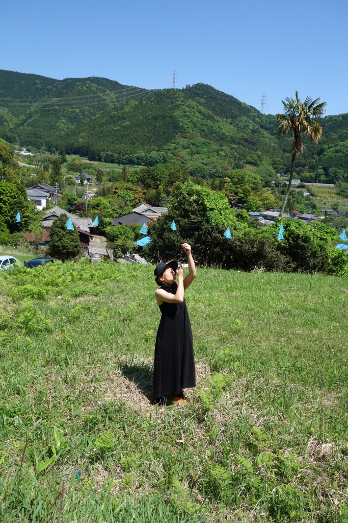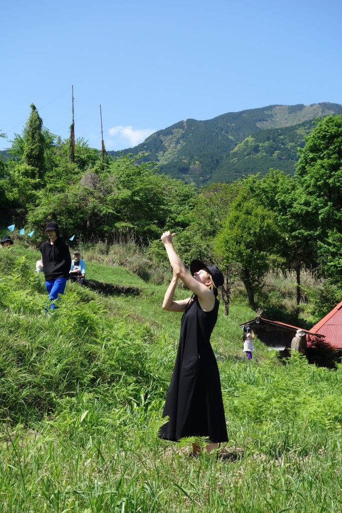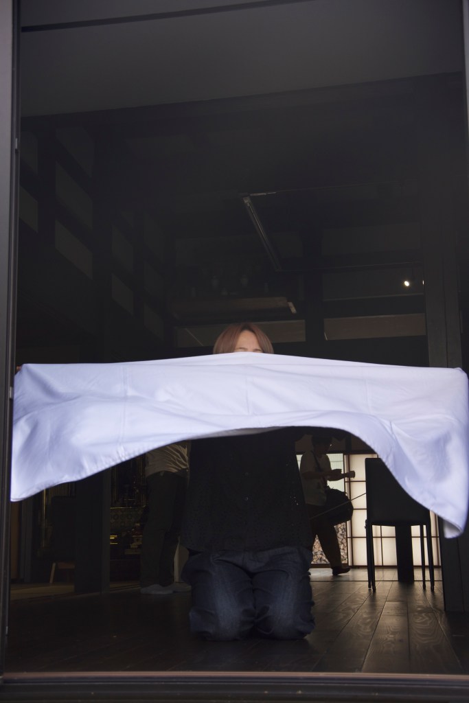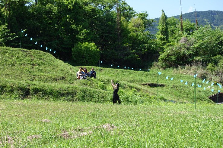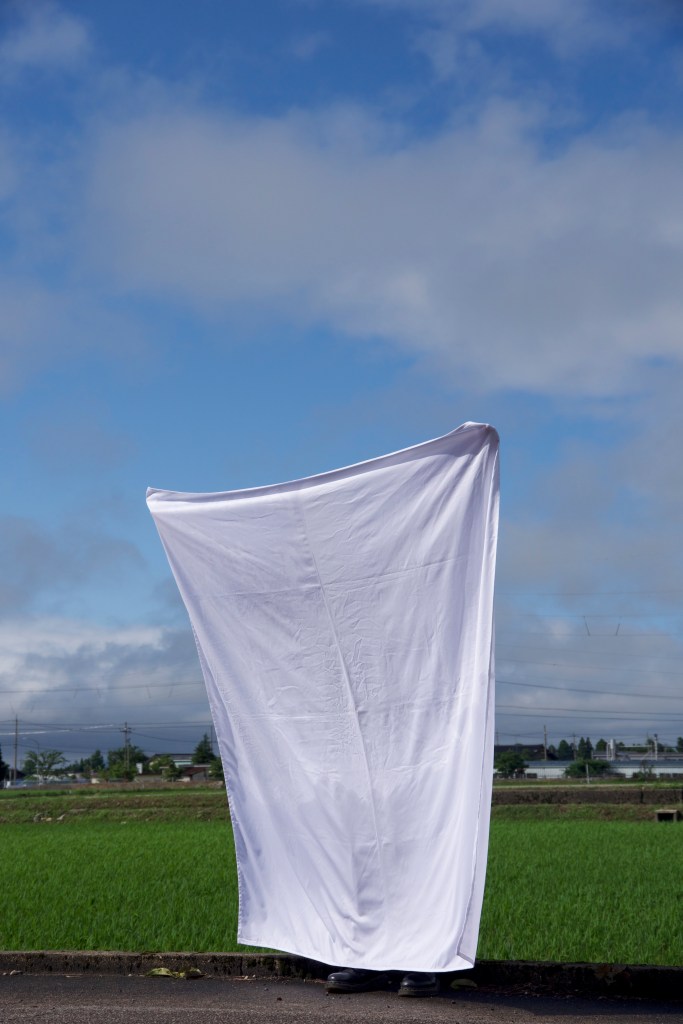 奉納のパフォーマンス。相撲のように四股を踏む。頭に葉の形のアクセサリーを付ける。五色の毛糸を足首に括り付け、観客に手渡す。目隠しをし、石畳の上にうつ伏せる。ゆっくりと腕で体を引きずりながら進み始める。長谷寺の門をくぐる。五色の毛糸は観客の手の中で糸をはきだし続ける。門に続く長い石階段を手探りで降りる。体が擦れる。目が見えないととどこまでも階段が続いていくように思える。通りがかる人が不思議そうに見つめる。階段の中腹で目隠しを外し、パフォーマンスを終わりにする。