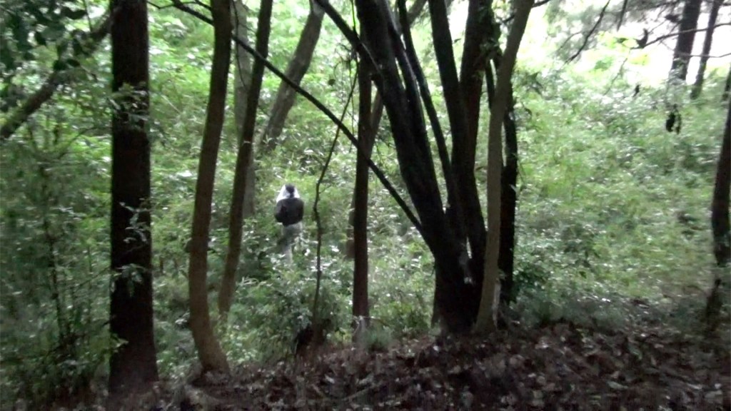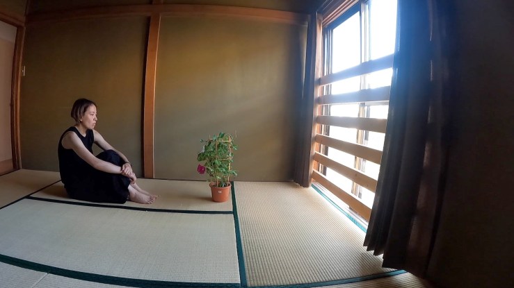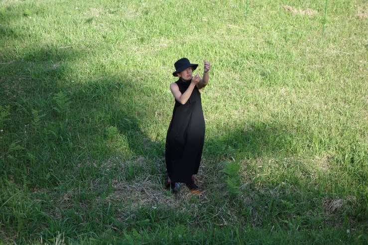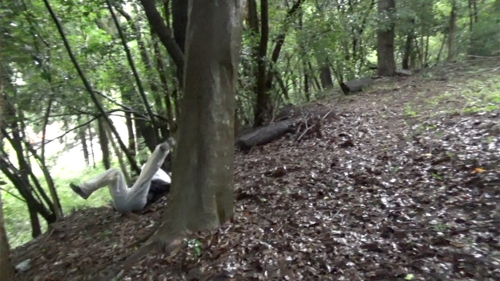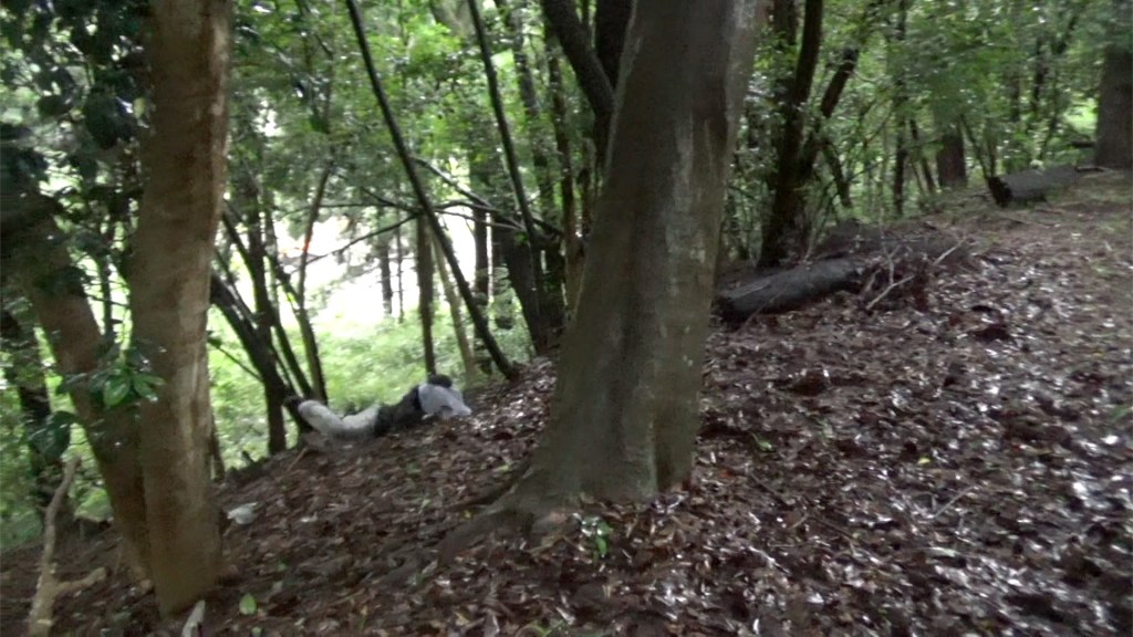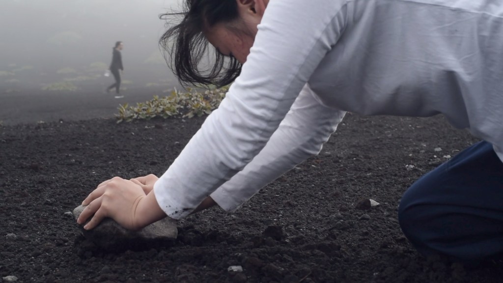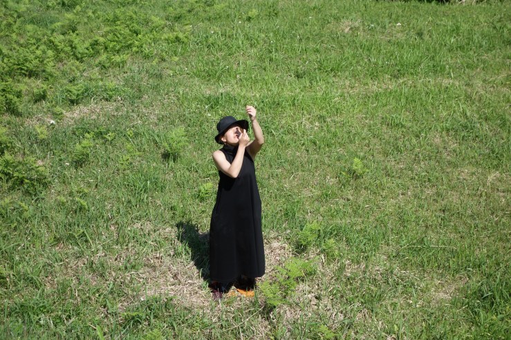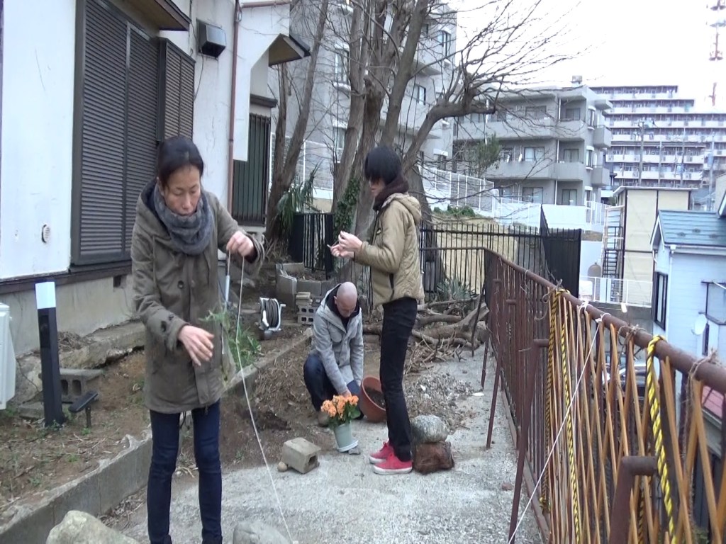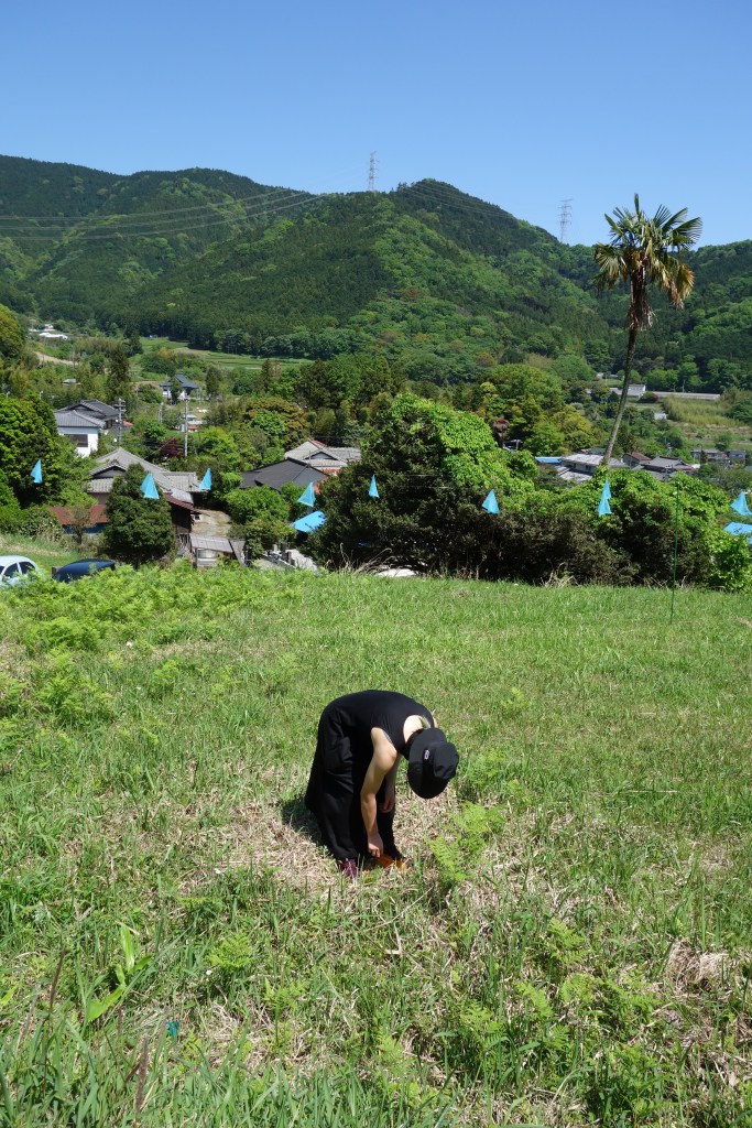 奉納のパフォーマンス。相撲のように四股を踏む。頭に葉の形のアクセサリーを付ける。五色の毛糸を足首に括り付け、観客に手渡す。目隠しをし、石畳の上にうつ伏せる。ゆっくりと腕で体を引きずりながら進み始める。長谷寺の門をくぐる。五色の毛糸は観客の手の中で糸をはきだし続ける。門に続く長い石階段を手探りで降りる。体が擦れる。目が見えないととどこまでも階段が続いていくように思える。通りがかる人が不思議そうに見つめる。階段の中腹で目隠しを外し、パフォーマンスを終わりにする。