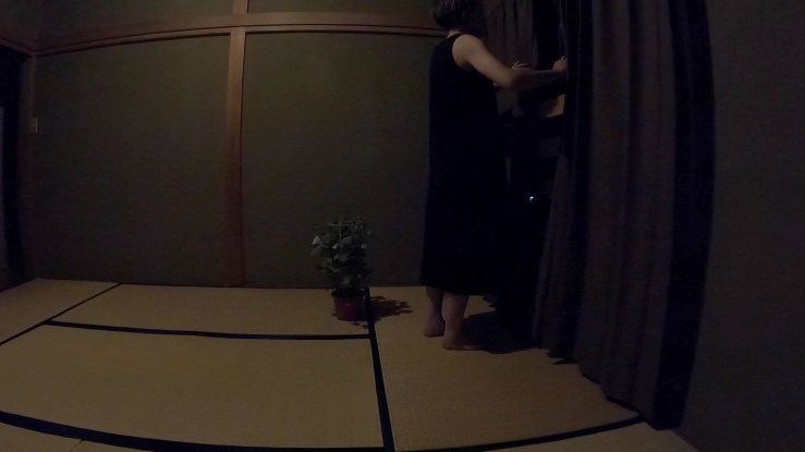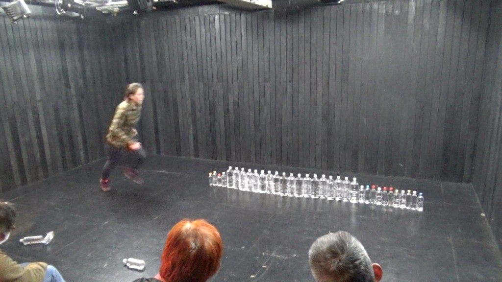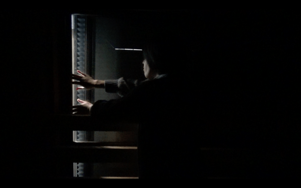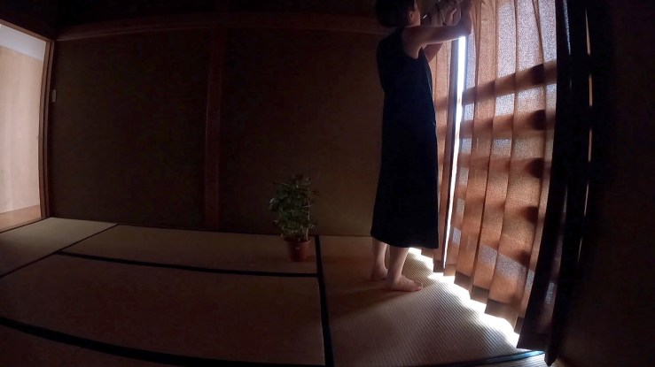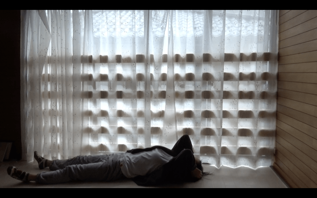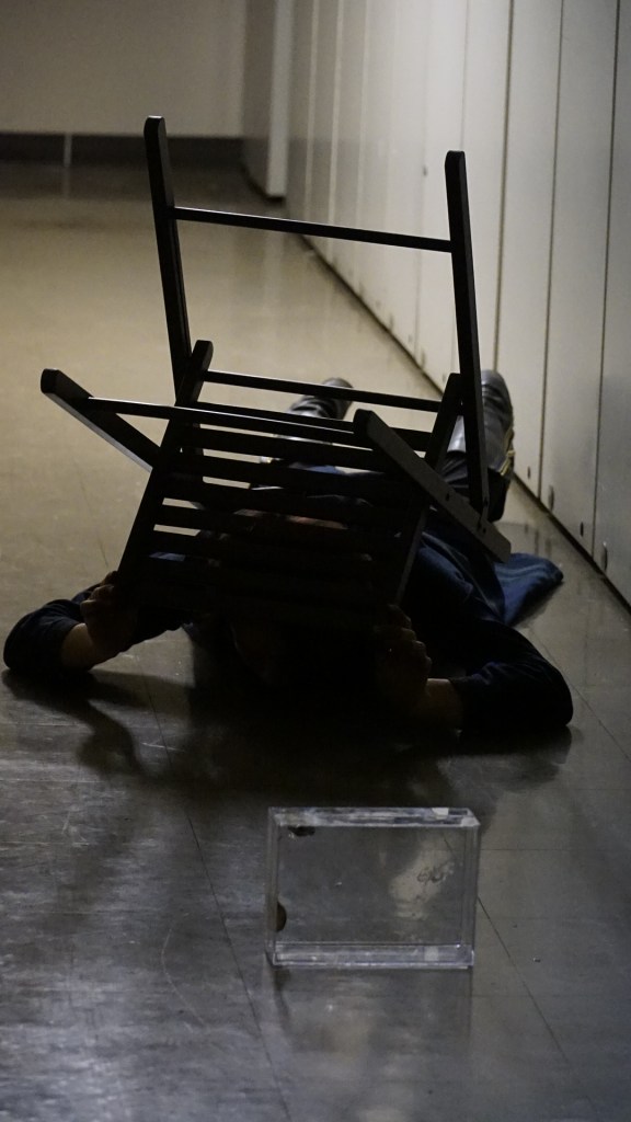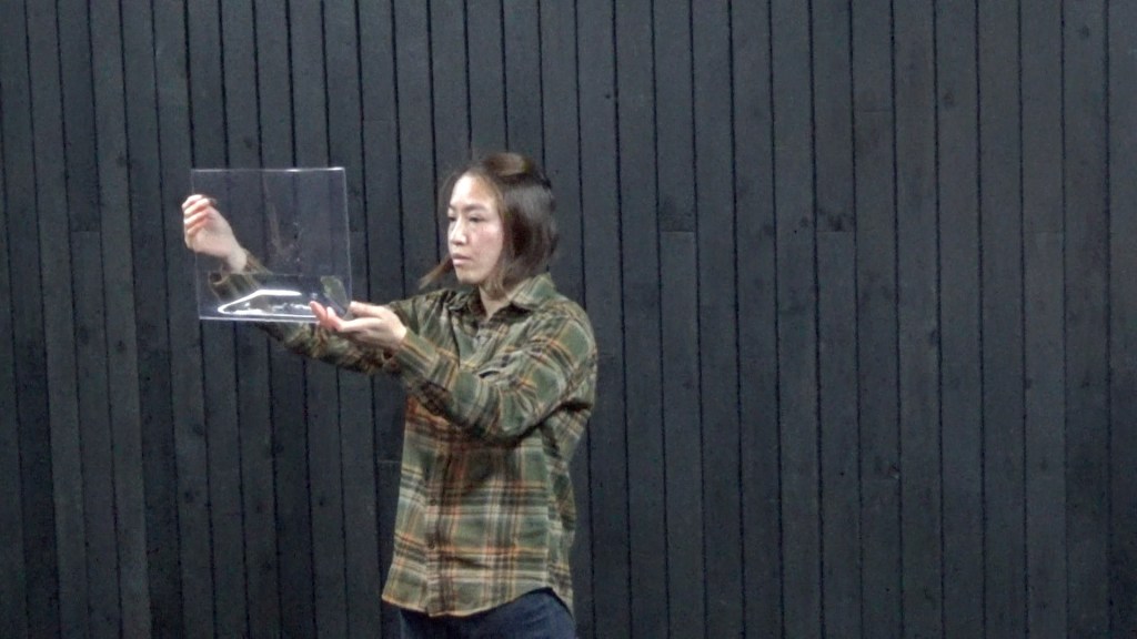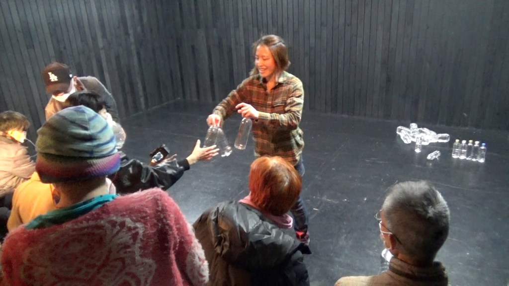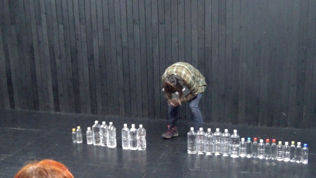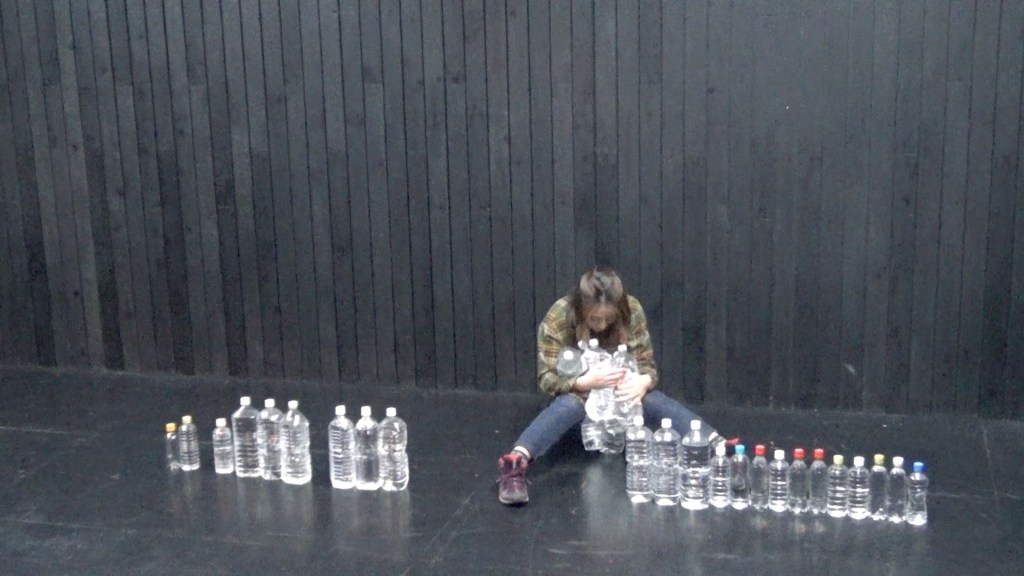 description: 透明のシートを足で引っ張りながら出してくる。足にシートを絡めながら時計周りに回転する。次は反時計回り、ごそっごそっと音がする。髪を三つ編みに編む。ビニール袋を編み込む。赤い毛糸で止める。4箇所編み込むと袋が顔の下に空間を作る。水を飲み、袋に吐き出してゆく。吐き出す水は赤い。また飲み吐き出す。段々と水が溜まるにつれて、ゆっくりと体をかがめているようだ。赤い水が床に着く。ゆっくりと透明のシートにくるまる。シートの中でひっそりと赤い水の入った袋を切った。水が溢れてゆく。しばしくるまり、終わる。