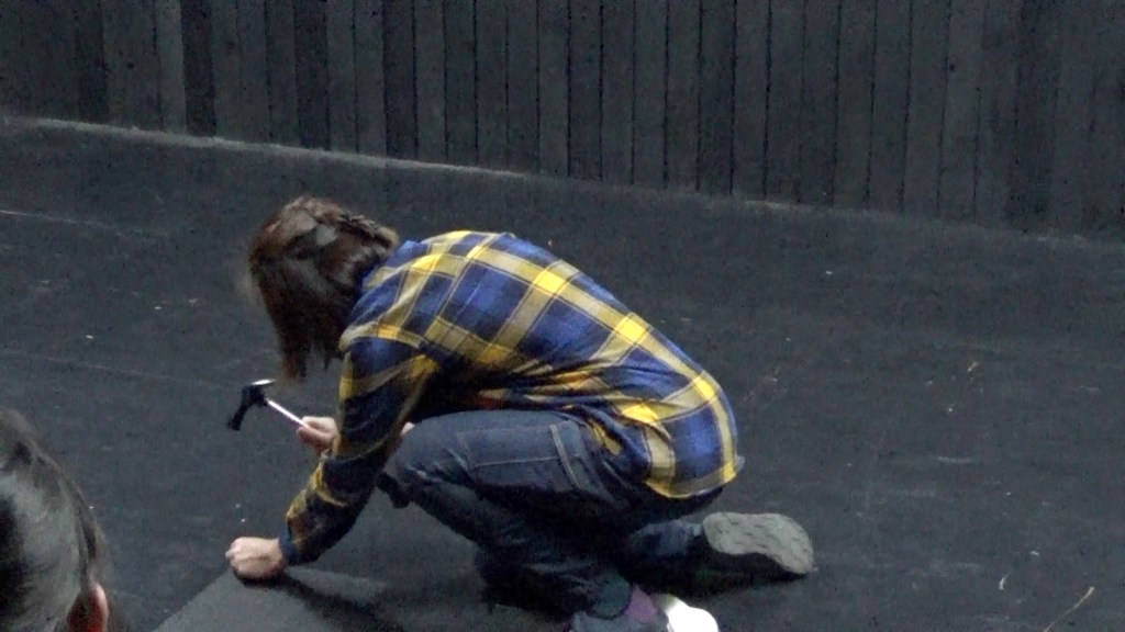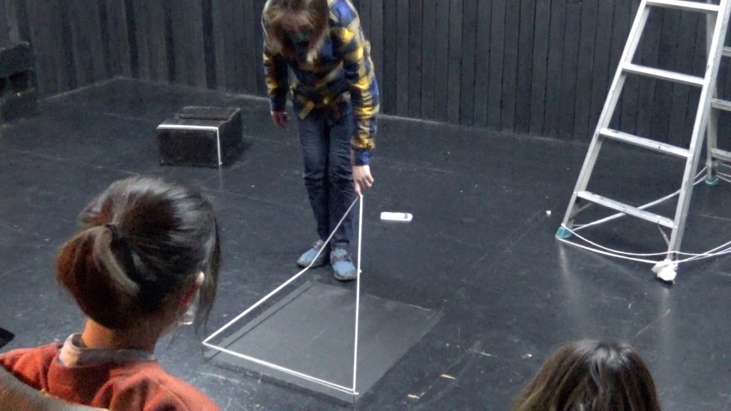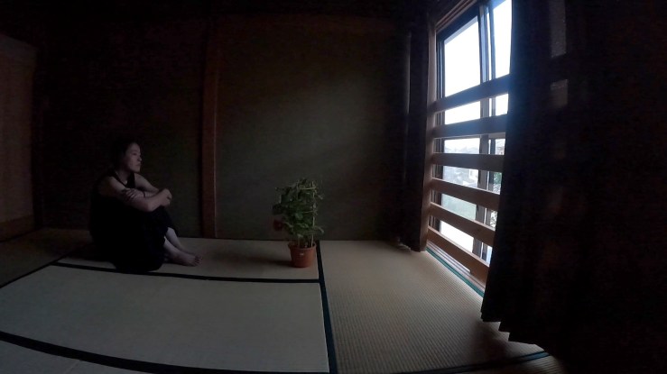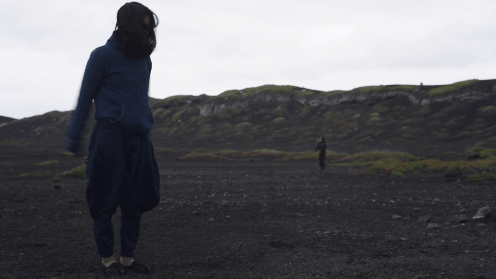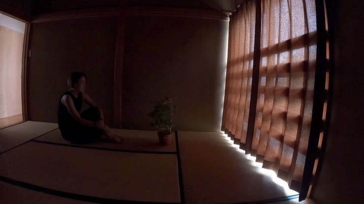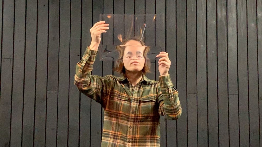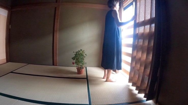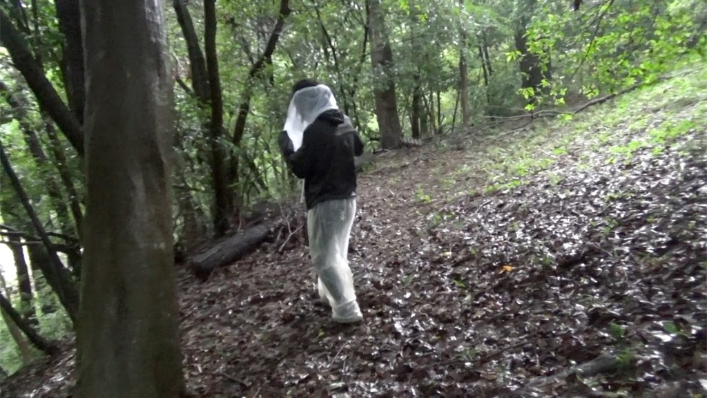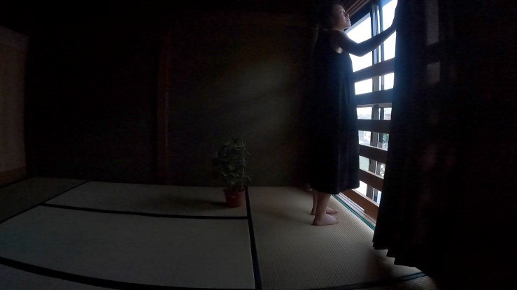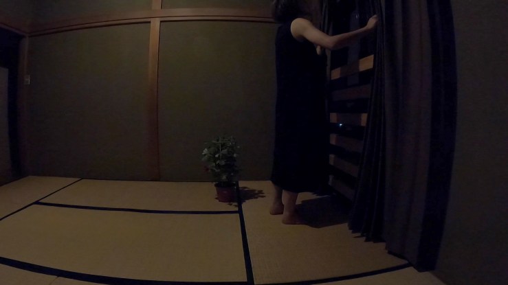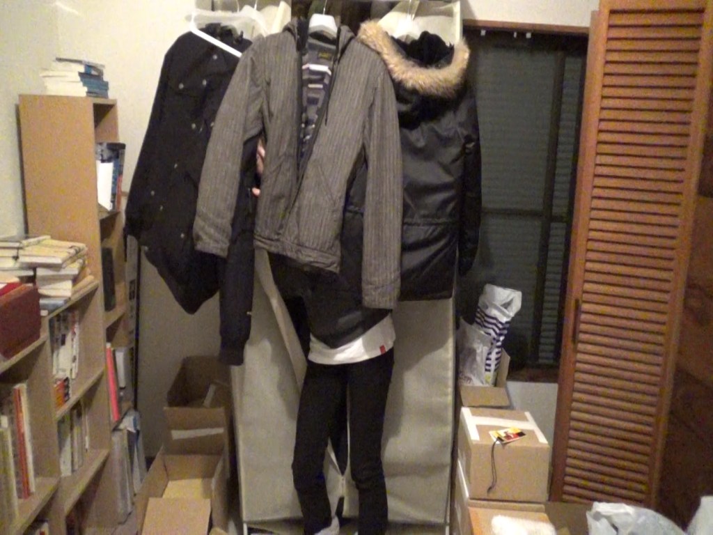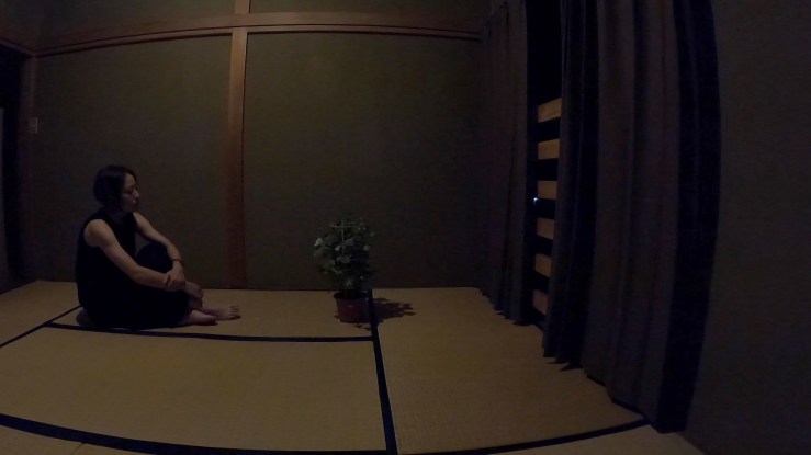 description: 透明のシートを足で引っ張りながら出してくる。足にシートを絡めながら時計周りに回転する。次は反時計回り、ごそっごそっと音がする。髪を三つ編みに編む。ビニール袋を編み込む。赤い毛糸で止める。4箇所編み込むと袋が顔の下に空間を作る。水を飲み、袋に吐き出してゆく。吐き出す水は赤い。また飲み吐き出す。段々と水が溜まるにつれて、ゆっくりと体をかがめているようだ。赤い水が床に着く。ゆっくりと透明のシートにくるまる。シートの中でひっそりと赤い水の入った袋を切った。水が溢れてゆく。しばしくるまり、終わる。