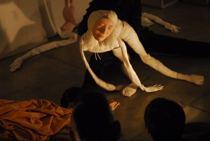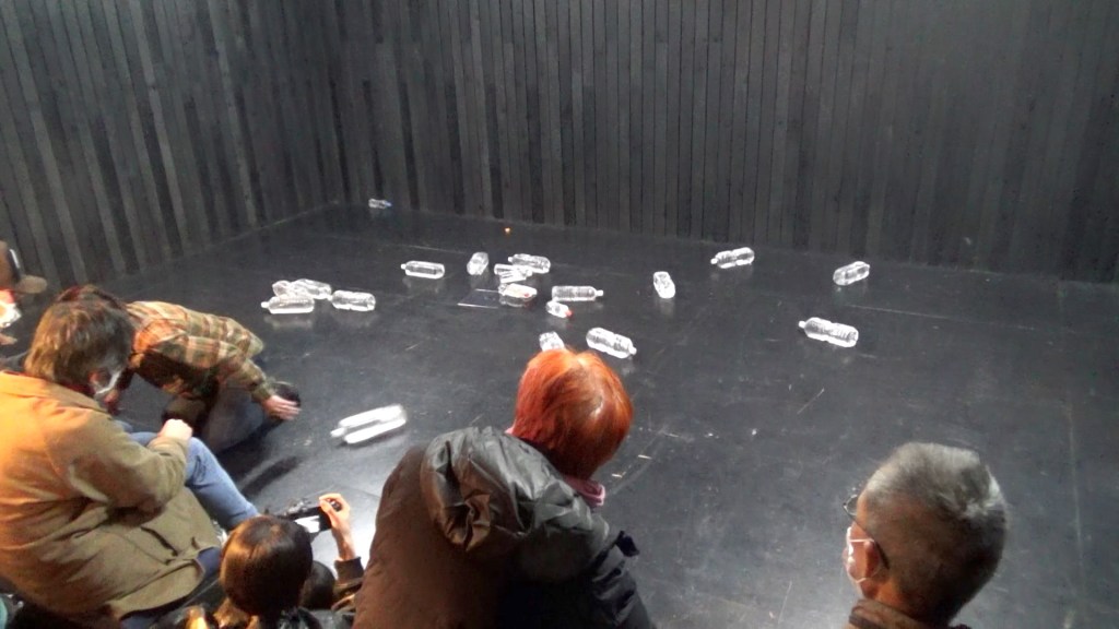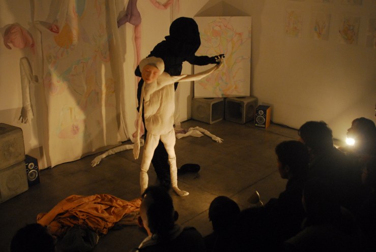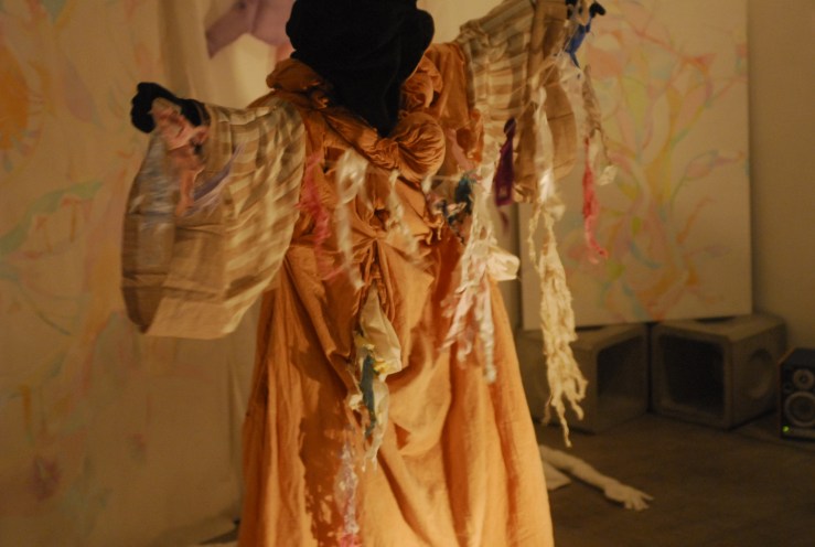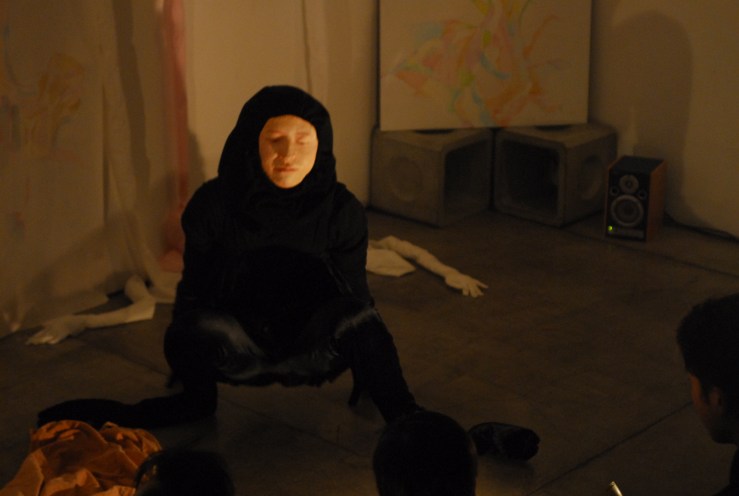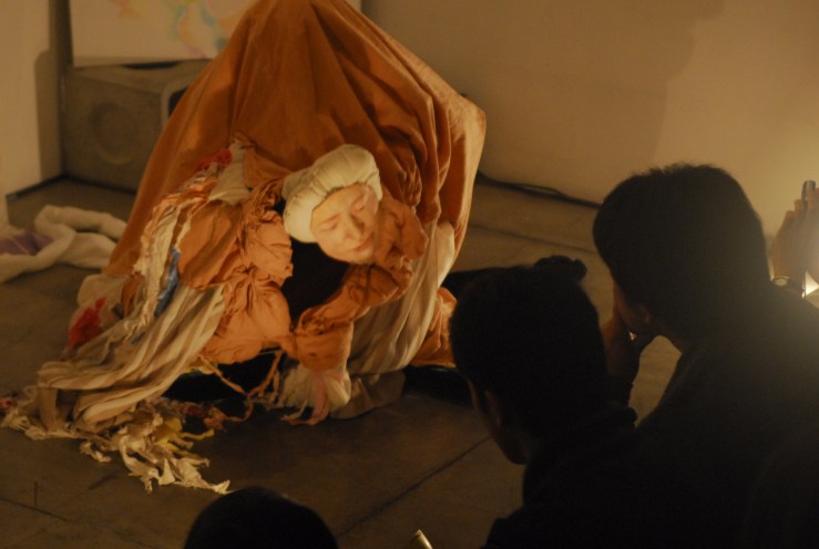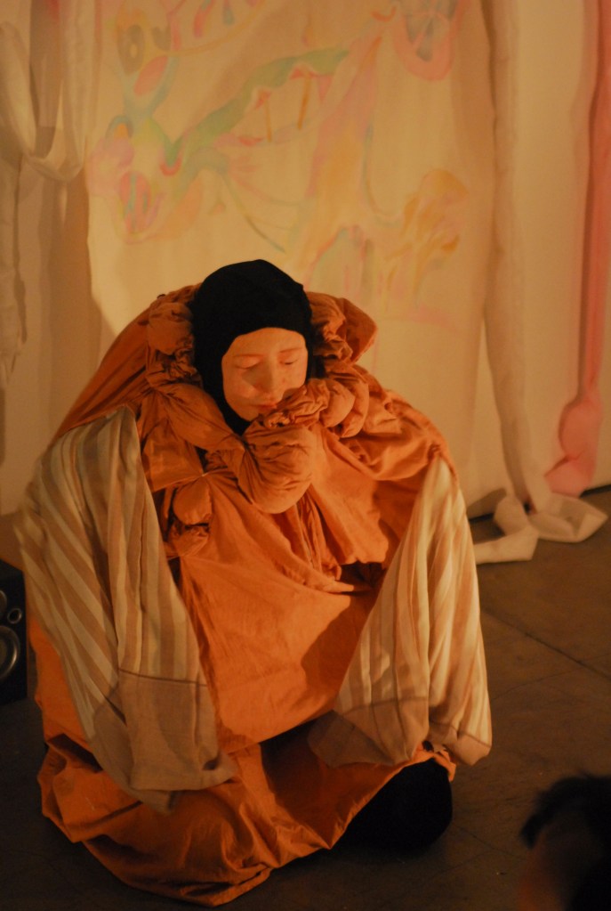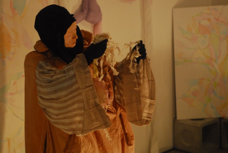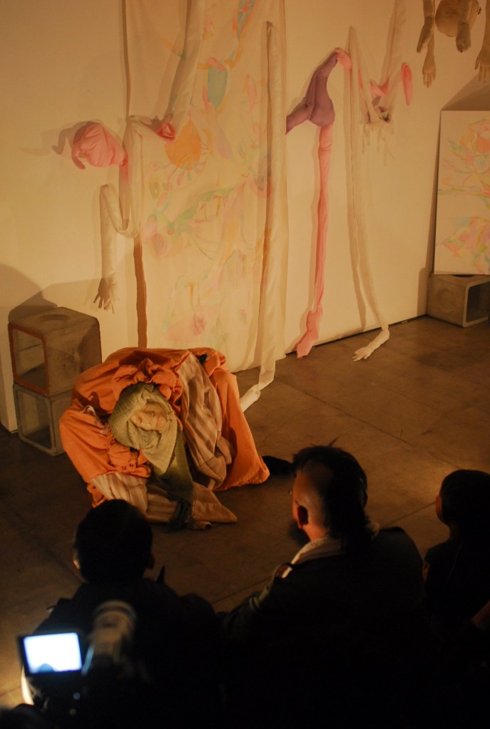最初のパフォーマンスは制作の中で作った人間の形の作品に、人形師岡本芳一さんに脚本を付けてもらう人形劇でした。