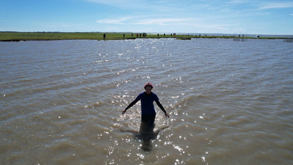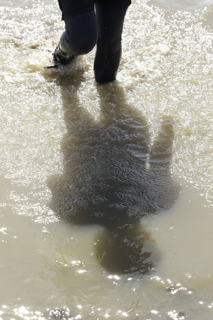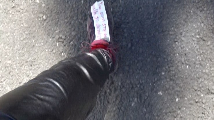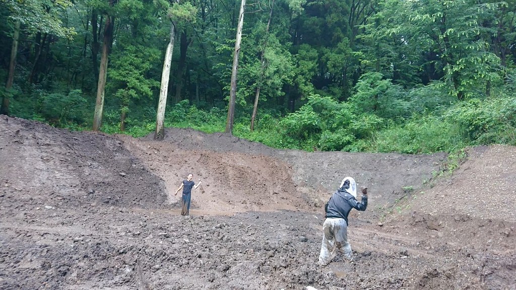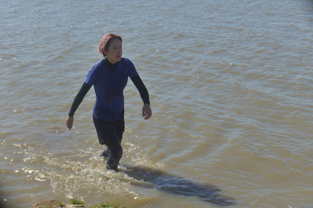 公共の汚いトイレで反物を一枚水で洗う。長さは12m。反物を引きずり歩いてゆく。川のよう。反物を切り、着る。唐辛子の粉を水でこね両手に付ける。手を差出し観客と合わせ、わたしは「穢れ」と相手は「ナジェス(ベンガル語で「穢れと」の意)」と声を合わせる。紙に手形をスタンプする。唐辛子の手形が広がってゆく。唐辛子の粉を頭から体へ塗りたくり、終わる。