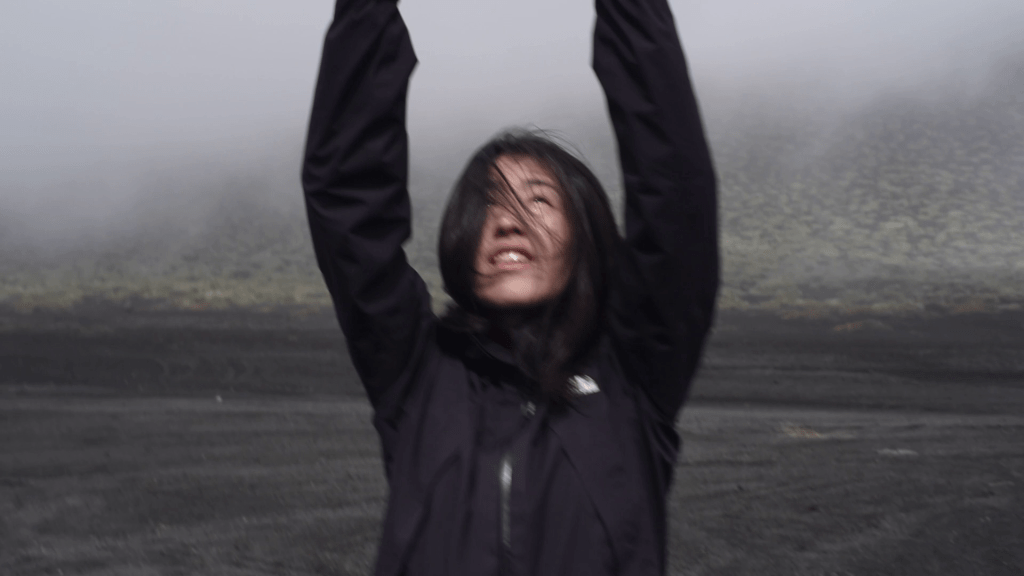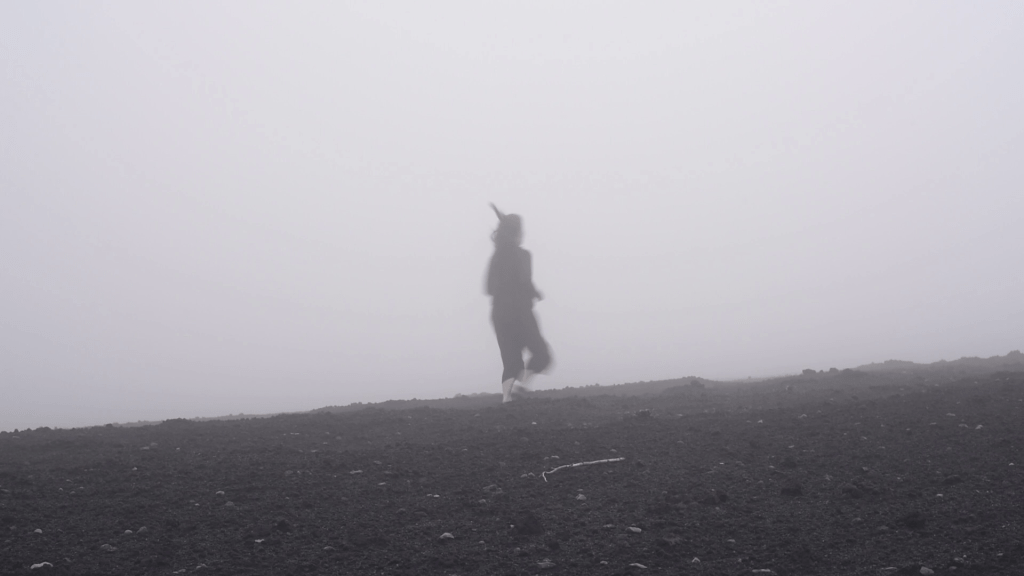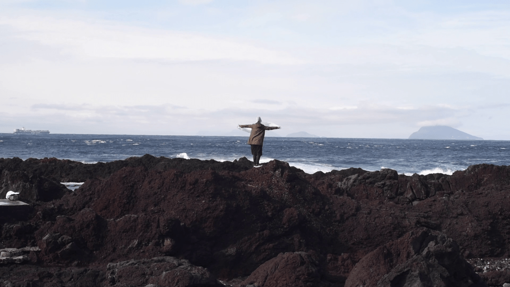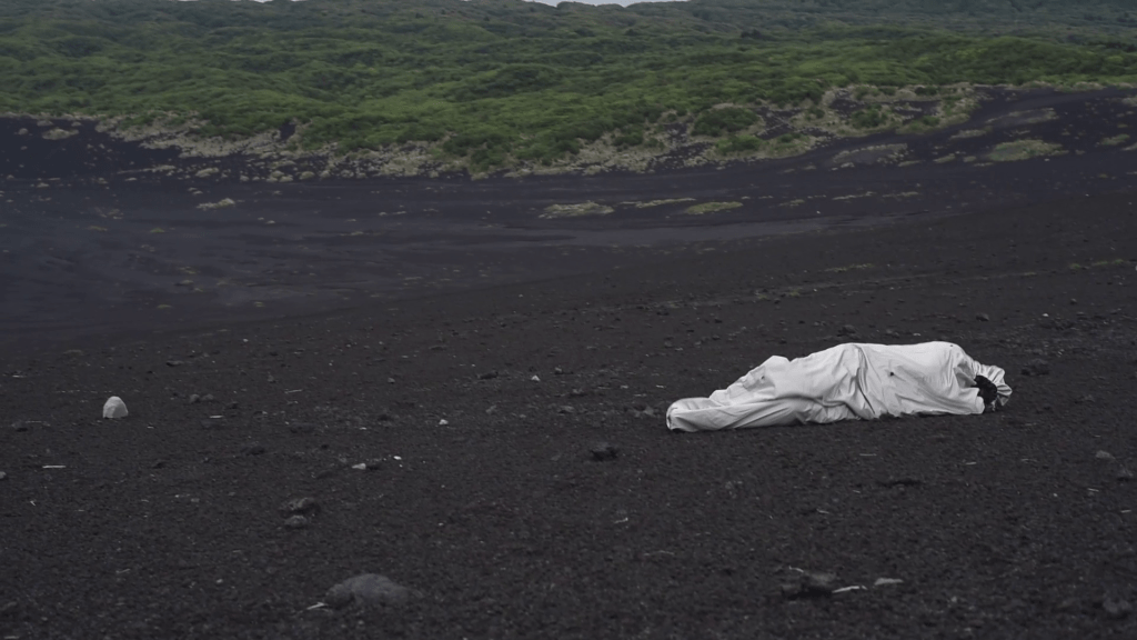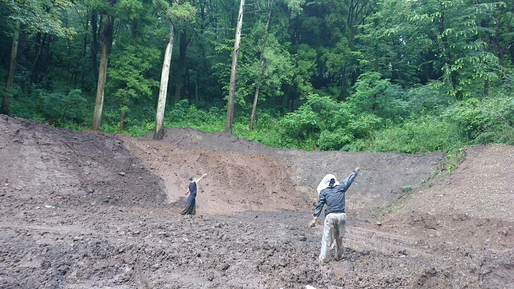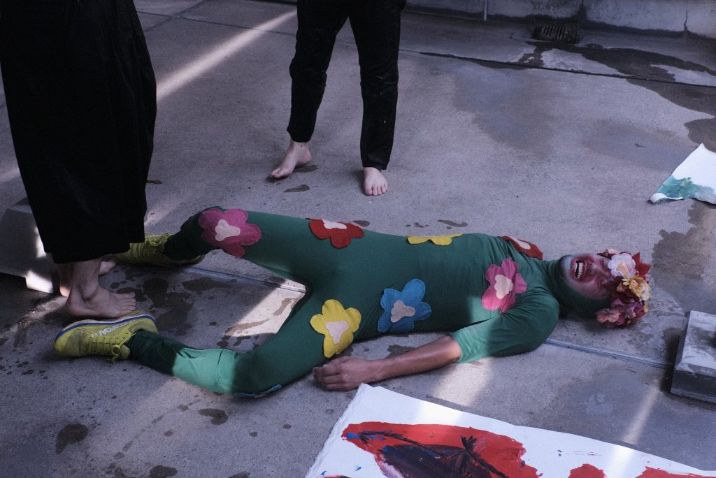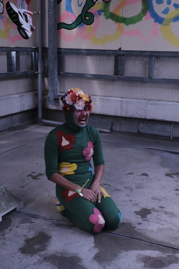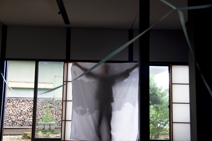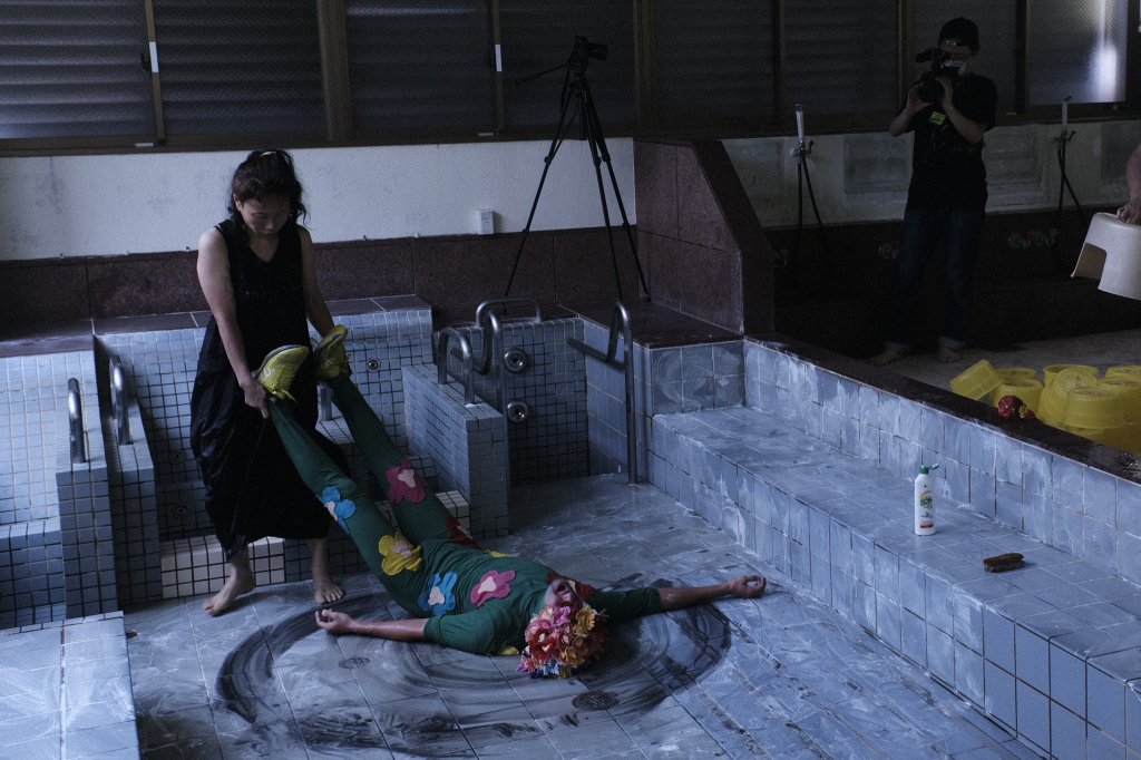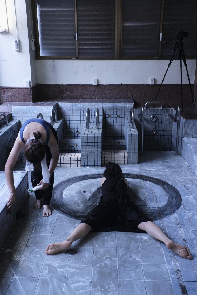 カッパを羽織り、中央で回りながら顔にハートのモチーフを付けてゆく。顔がハートでいっぱいになる。カッパを脱ぎ、上半身裸になる。隅で腹から首、右胸から左胸に線を引き十字架を付ける。シートの上に寝ころび、水を口に含む。クジラのように空中高く噴き上げる。バタバタバタッと水が体に落ちてくる。墨が落ちて流れる。また口に含み噴き上げる。咳き込む。含み噴き上げる。段々と体を縮めてゆく。体の形が気付くと変容している。縮めきるとシートにゆっくりとくるまり、そしてパフォーマンスが終わる。