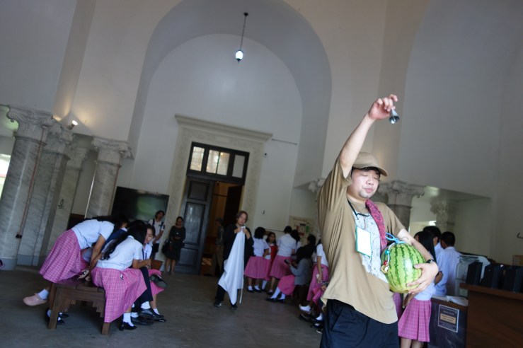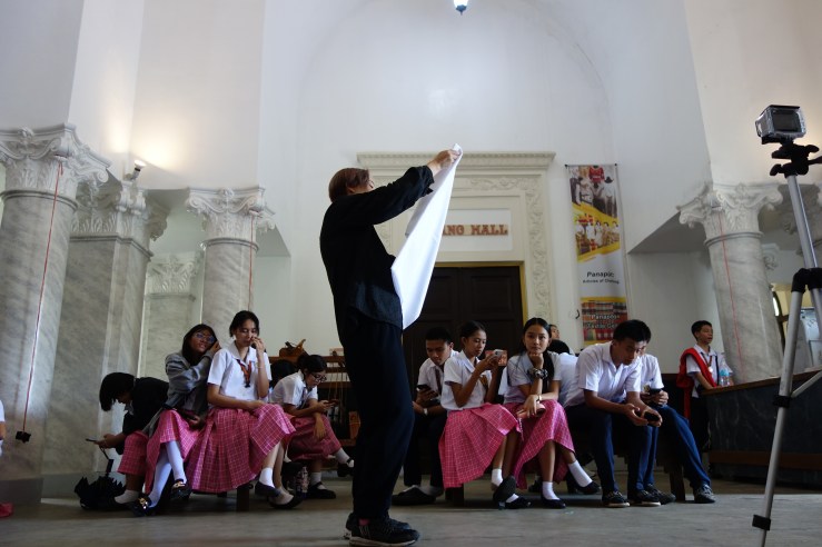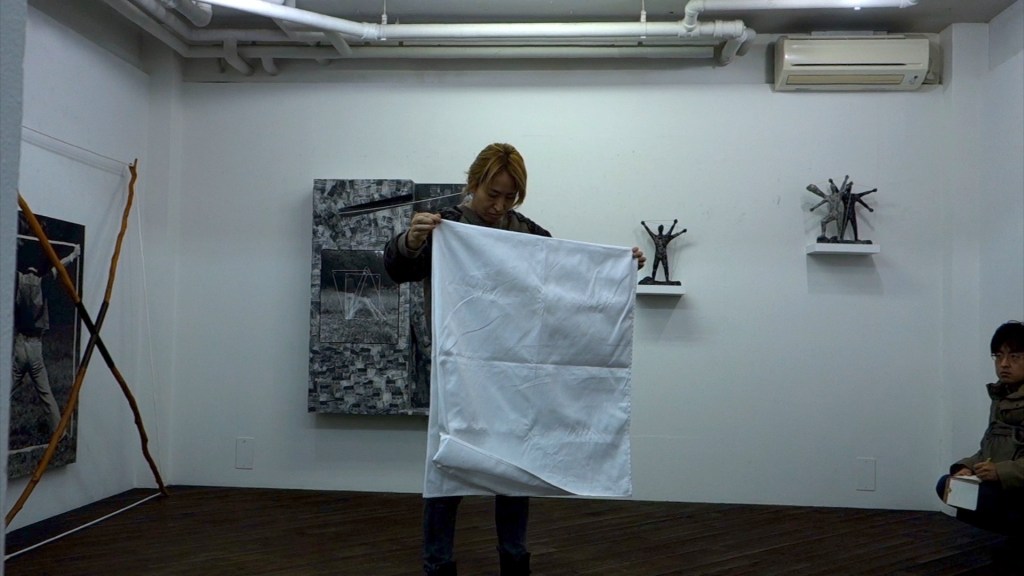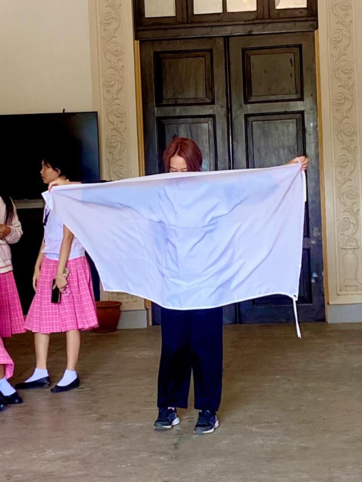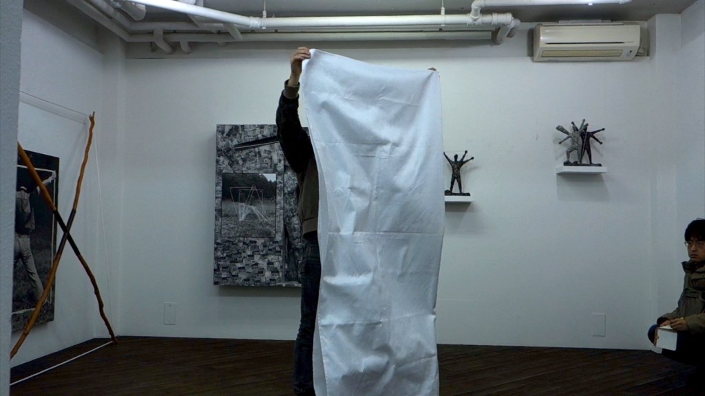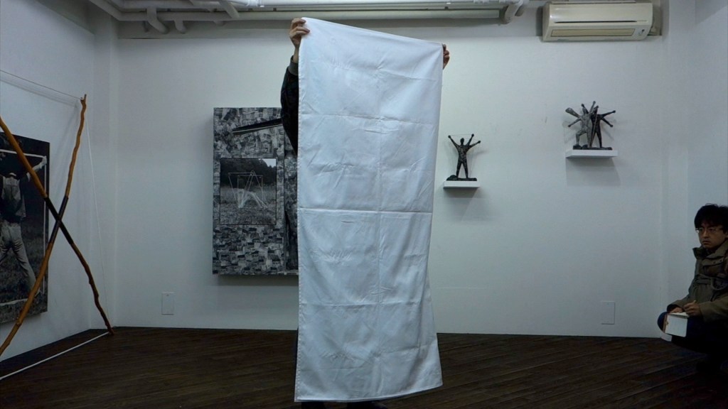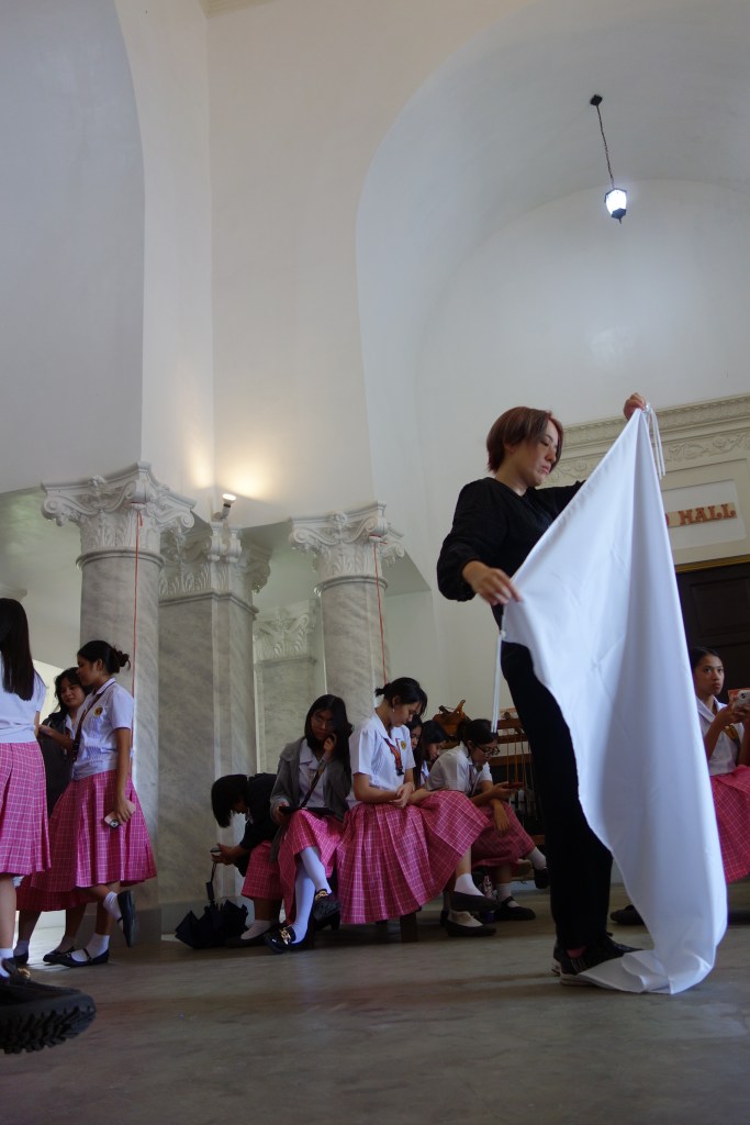 description: フィリピンの大学ギャラリーの前で白い旗を3時間広げたり畳んだりした。