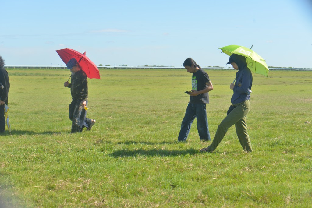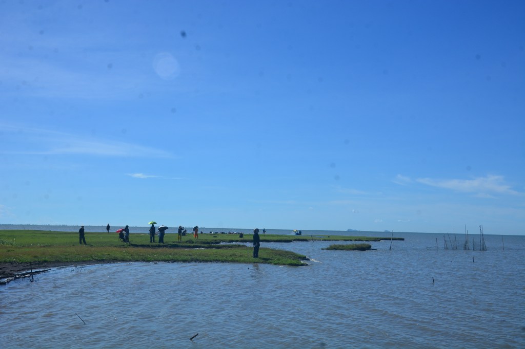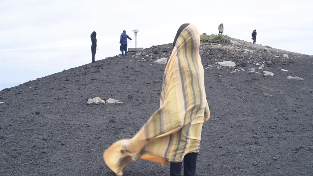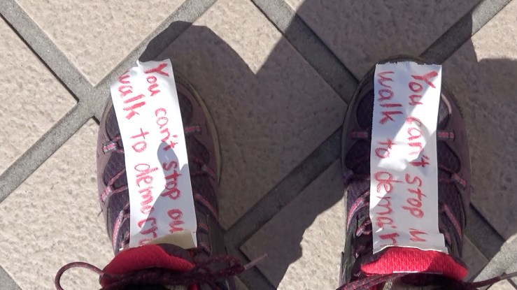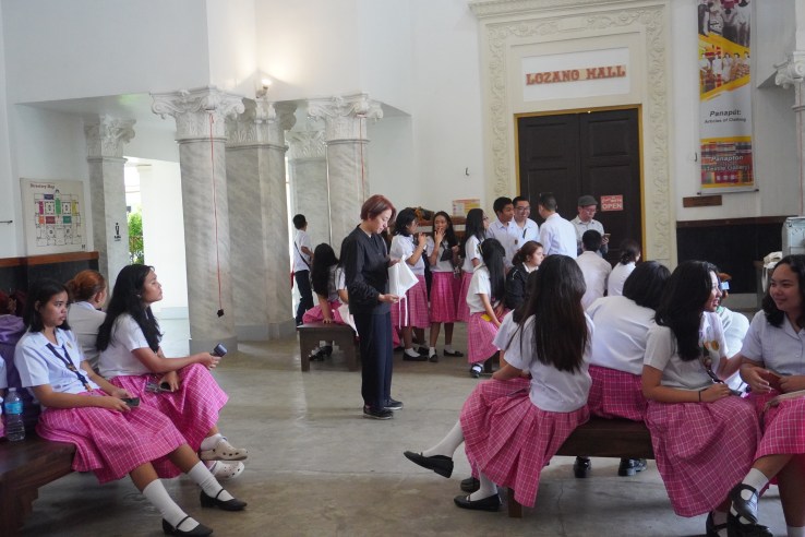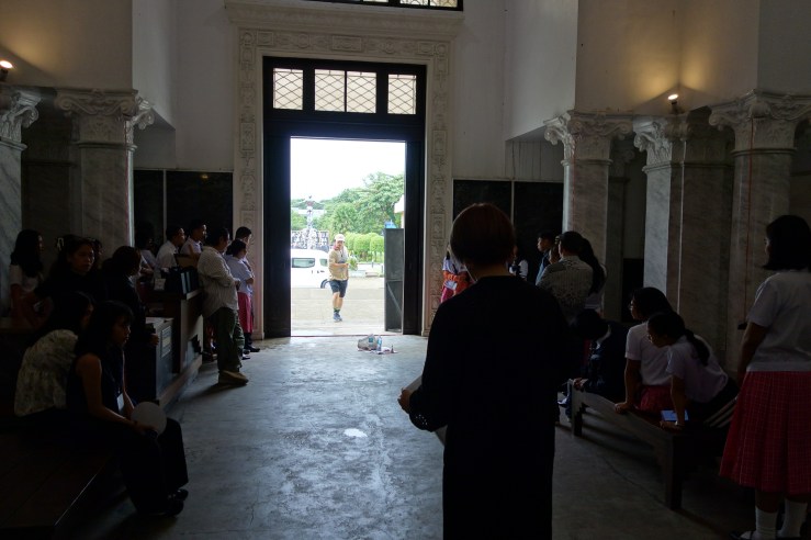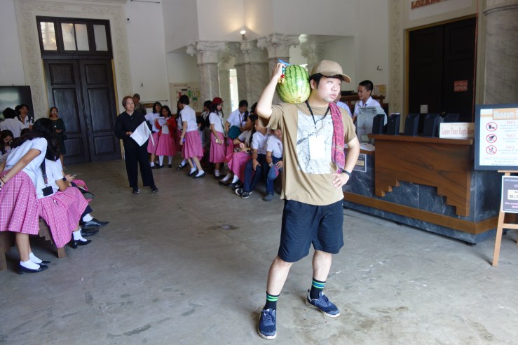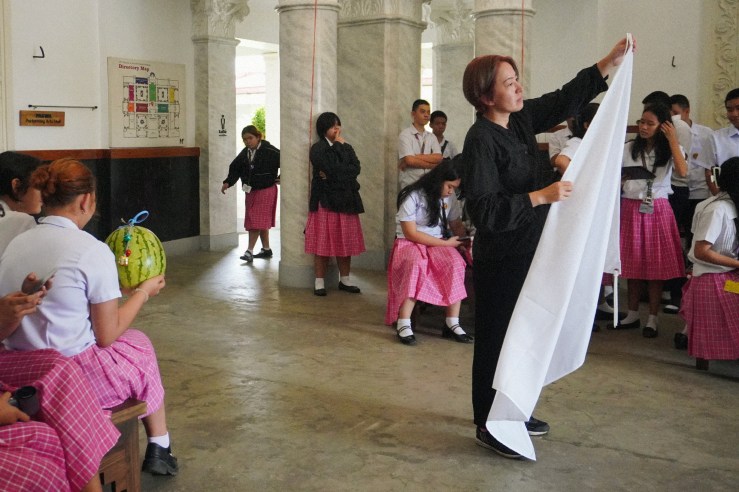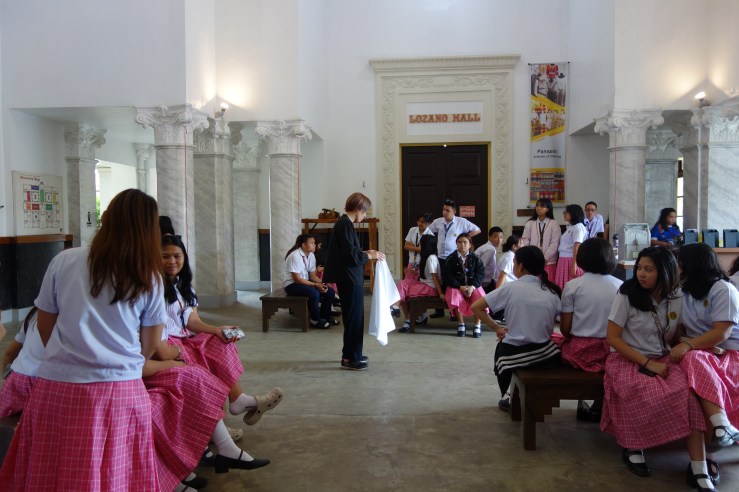 description: フィリピンの大学ギャラリーの前で白い旗を3時間広げたり畳んだりした。