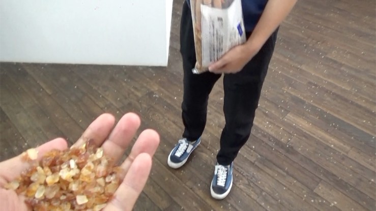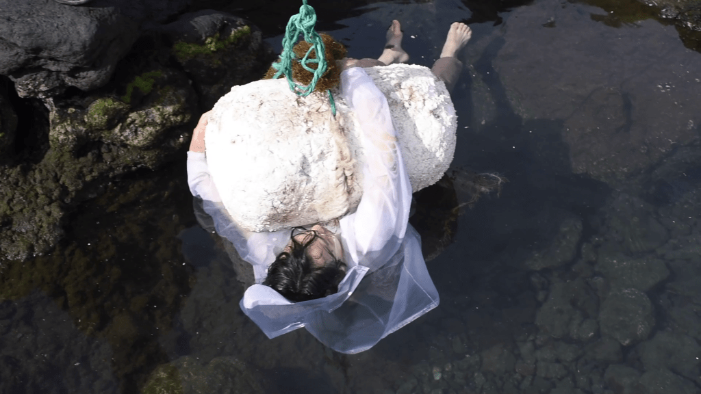 白い服を着て青い水を床に注ぐ。水はギャラリーの床の目地を通って碁盤目状に広がってゆく。ペニスの形をしたパーティ用ストローを一本一本指に挟み、手を震わせながら何度も顔に当てる。珊瑚を床に置き、ストローで床の水を吸って、珊瑚に吹きかける。珊瑚が青くなる。観客にストローを渡し、珊瑚を頭の上に載せ青い水を吹きかけさせる。白い服が青く染まる。服を脱ぎ裸になる。体を逆さにして珊瑚を性器に載せ、青い液体を吹きかけさせる。体に青い筋が何本も滴り落ちる。次は足の裏に載せ、最後は額に捧げ持ちギャラリーを後にする。