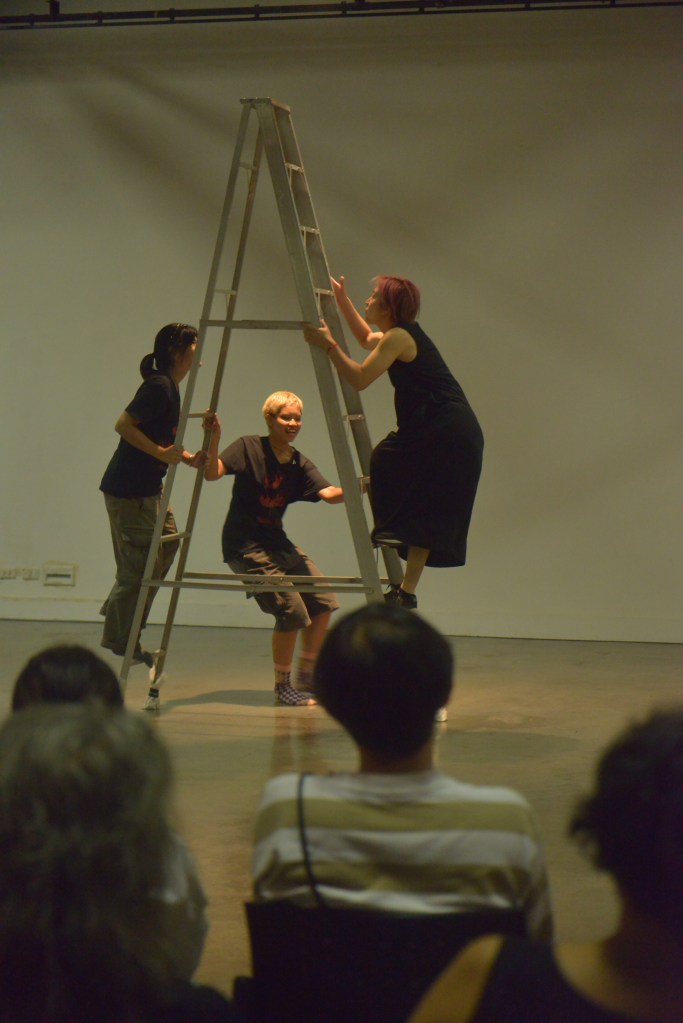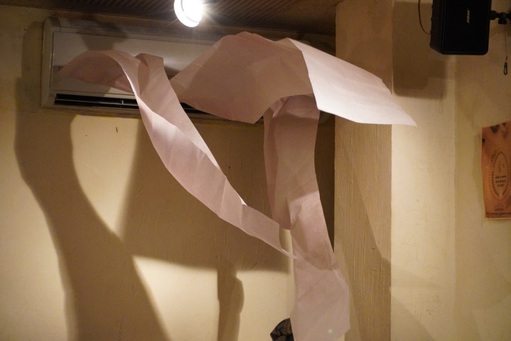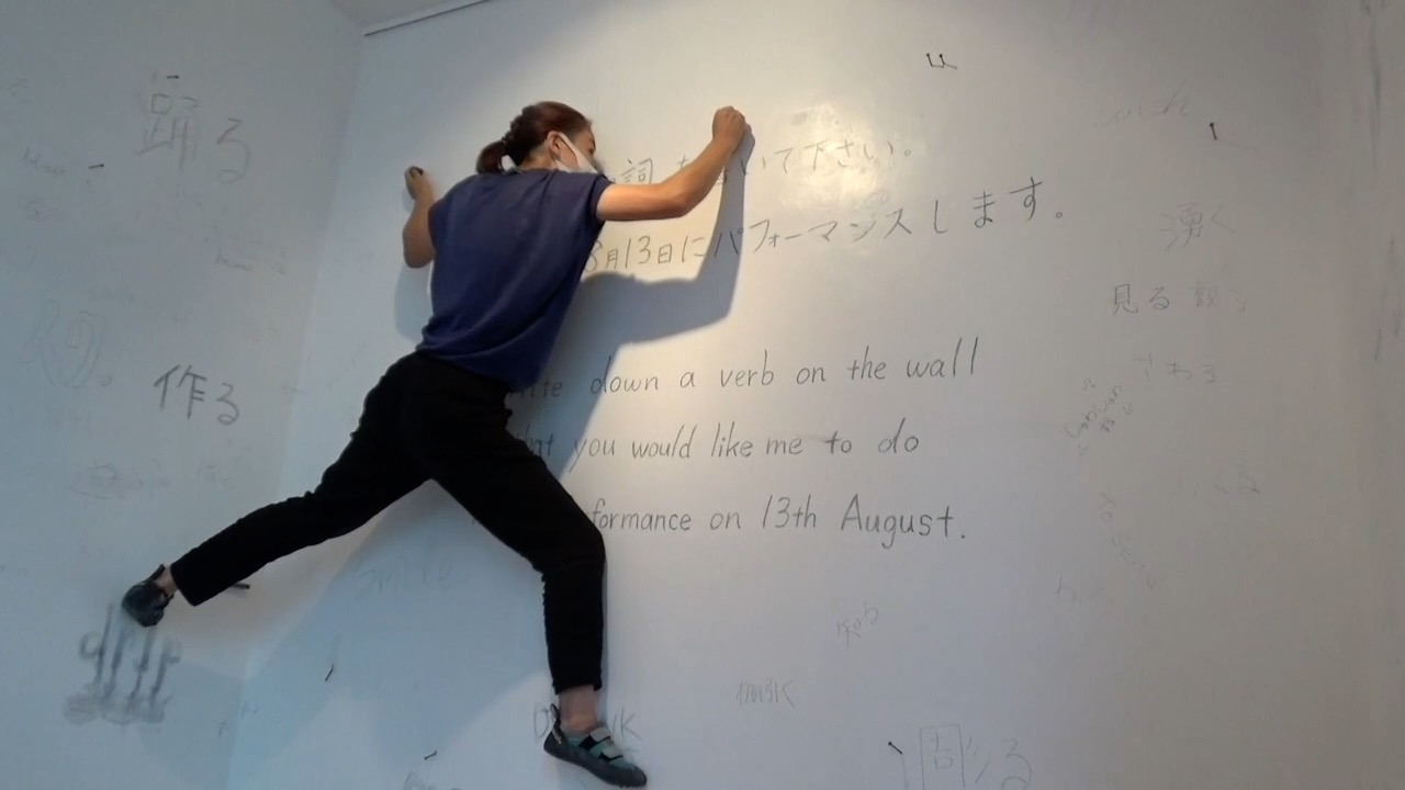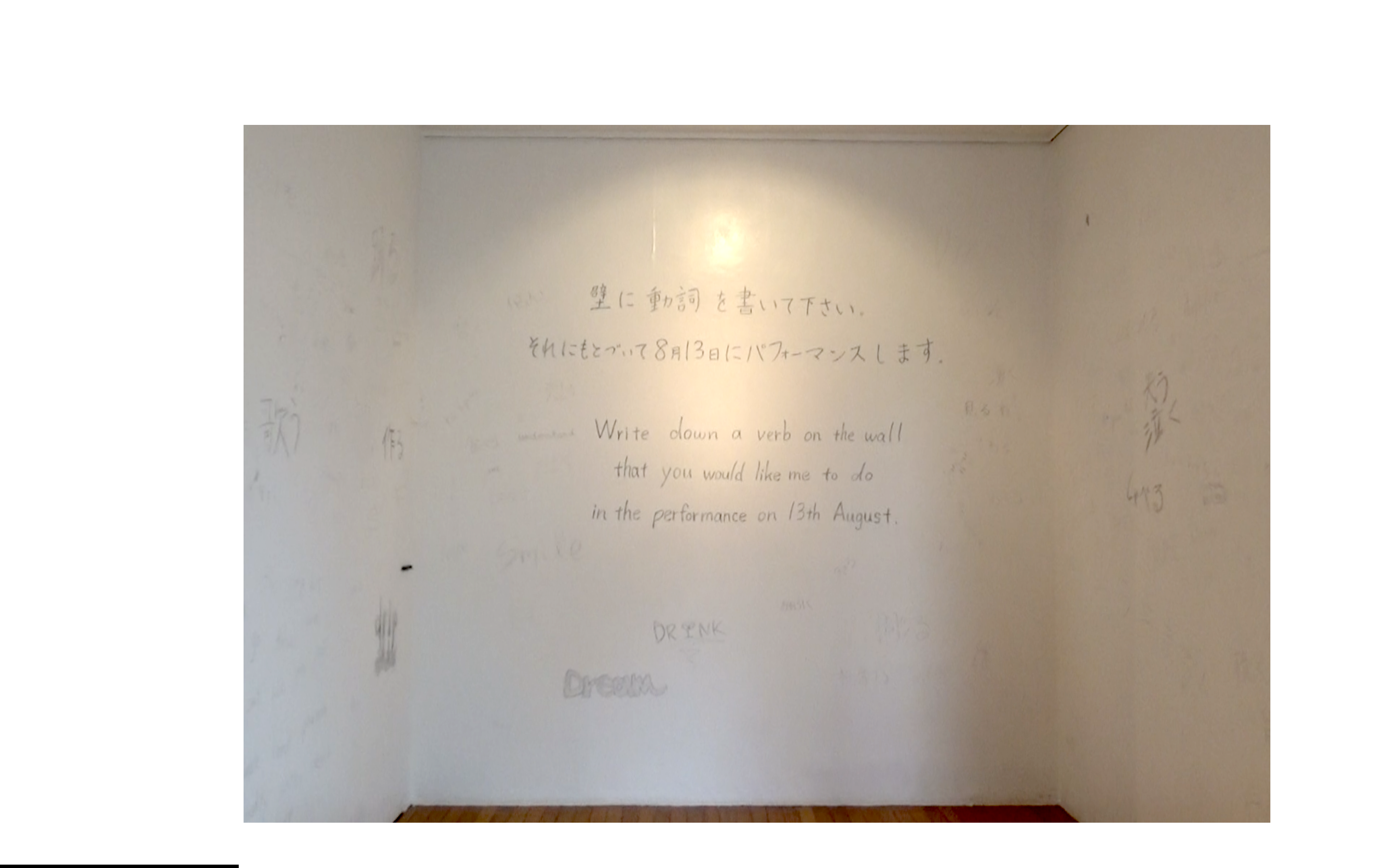 メキシコの地下鉄で物売りが口ずさんでいたフレーズを繰り返す。繰り返しながら、ミシン糸を歯に括り付けてゆく。調子外れ。糸を合わせ唾液が床に付くまで、唾液を垂らし糸にそわせ続ける。ミシン糸のボビンを観客の口の中に入れる。糸を引くとボビンは観客の口の中でコロコロと回る。糸を伸ばし洗濯バサミを付けていく。ボビンが終わるまで。後退りし口に括り付けた糸を引く、自然と観客が最初のフレーズを口ずさみ始める。糸が切れてゆく。歯が痛い。布で顔を隠す。子供用の白いドレスを捧げ持ち、目が見えないまま床を這う。手に触れた洗濯バサミをドレスに付けてゆく。全て付け終えて、パフォーマンスが終わる。