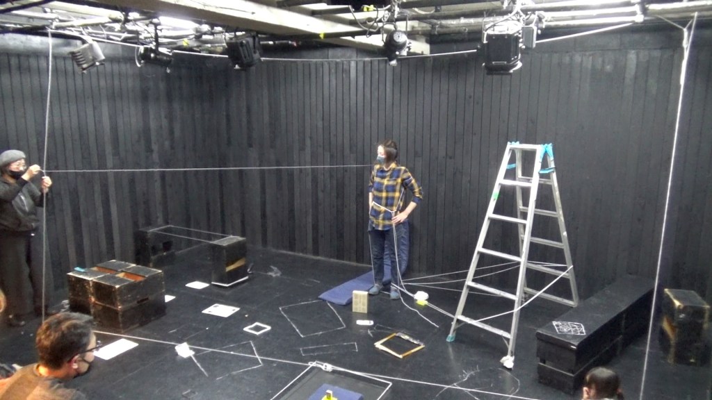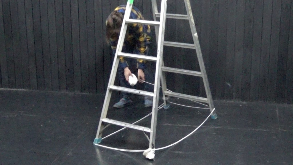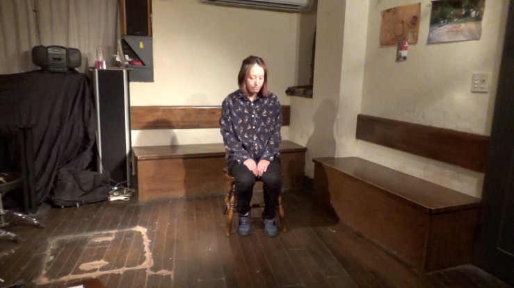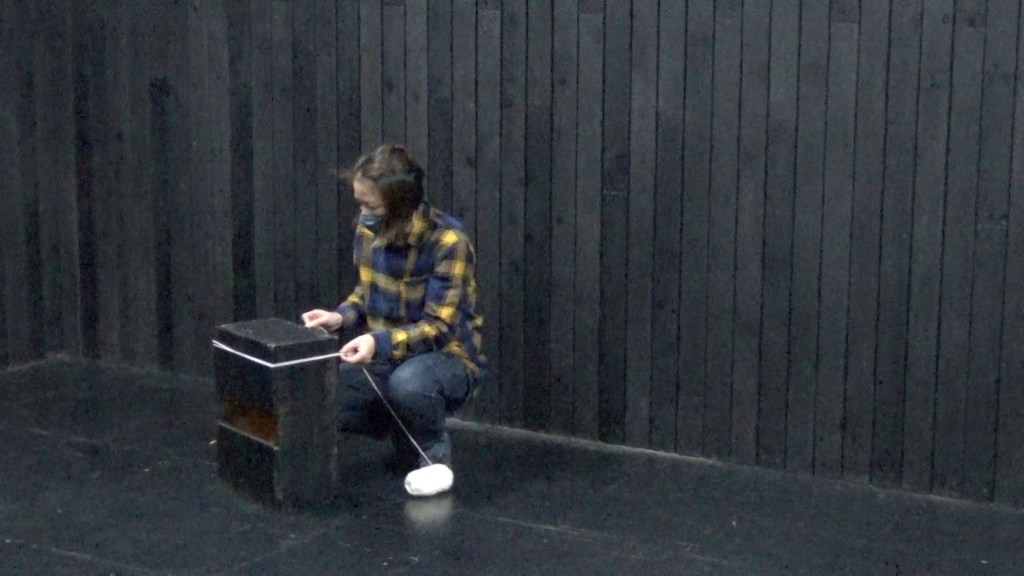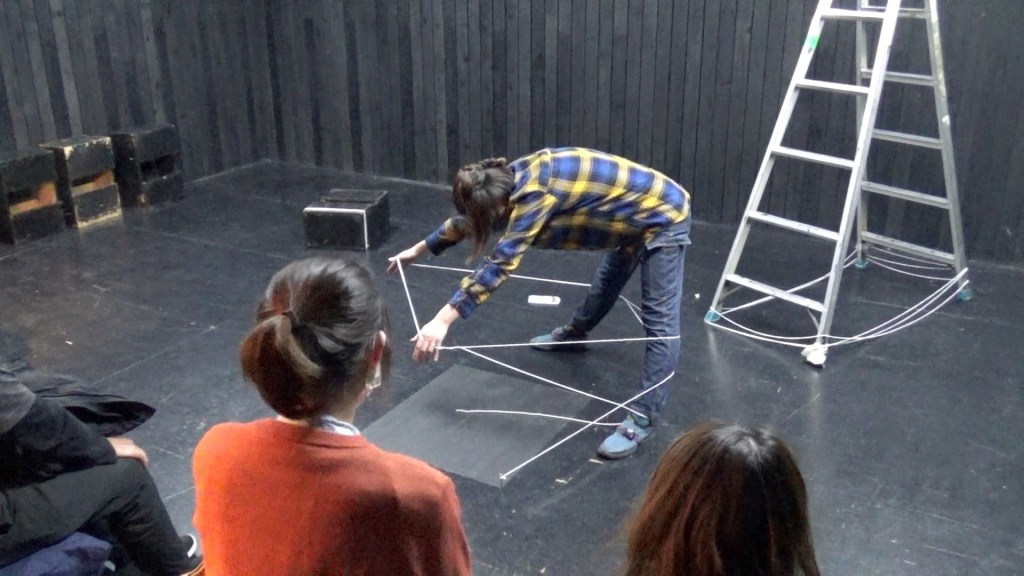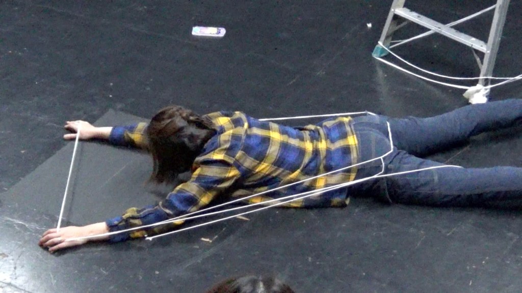 メキシコの地下鉄で物売りが口ずさんでいたフレーズを繰り返す。繰り返しながら、ミシン糸を歯に括り付けてゆく。調子外れ。糸を合わせ唾液が床に付くまで、唾液を垂らし糸にそわせ続ける。ミシン糸のボビンを観客の口の中に入れる。糸を引くとボビンは観客の口の中でコロコロと回る。糸を伸ばし洗濯バサミを付けていく。ボビンが終わるまで。後退りし口に括り付けた糸を引く、自然と観客が最初のフレーズを口ずさみ始める。糸が切れてゆく。歯が痛い。布で顔を隠す。子供用の白いドレスを捧げ持ち、目が見えないまま床を這う。手に触れた洗濯バサミをドレスに付けてゆく。全て付け終えて、パフォーマンスが終わる。