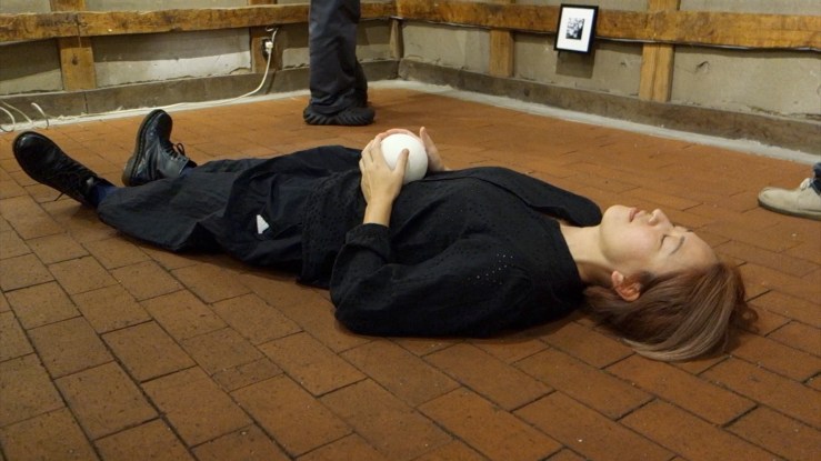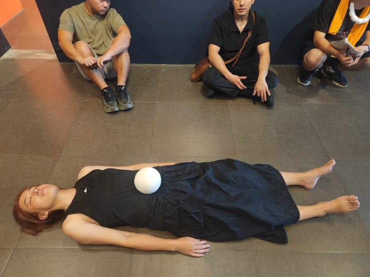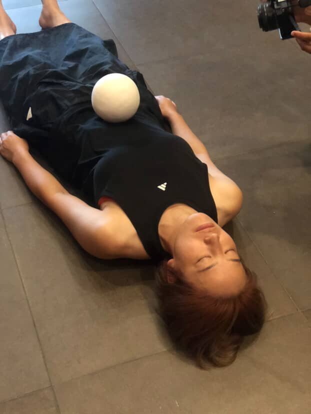 description: お客さんにお湯の入ったコップを持ってもらい、その間球をお腹の上に乗せて床に寝そべっていた。